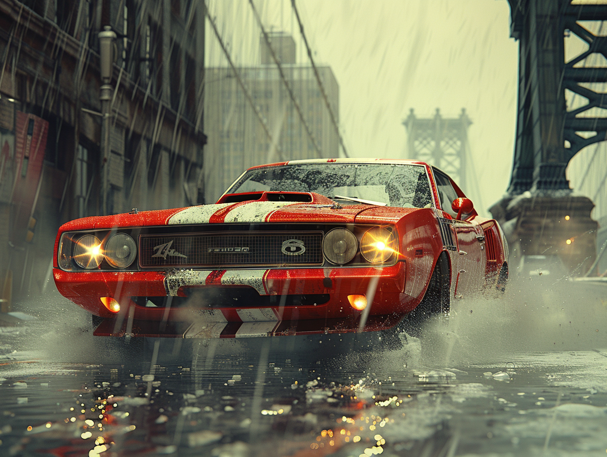 Prompt: 2010 racing film still of Fast Furious, filmed at Brooklyn Bridge, a muscle car drifting, dust, rain, custom racing, 4k, photorealistic, intricate details, and a lot more intricate details.