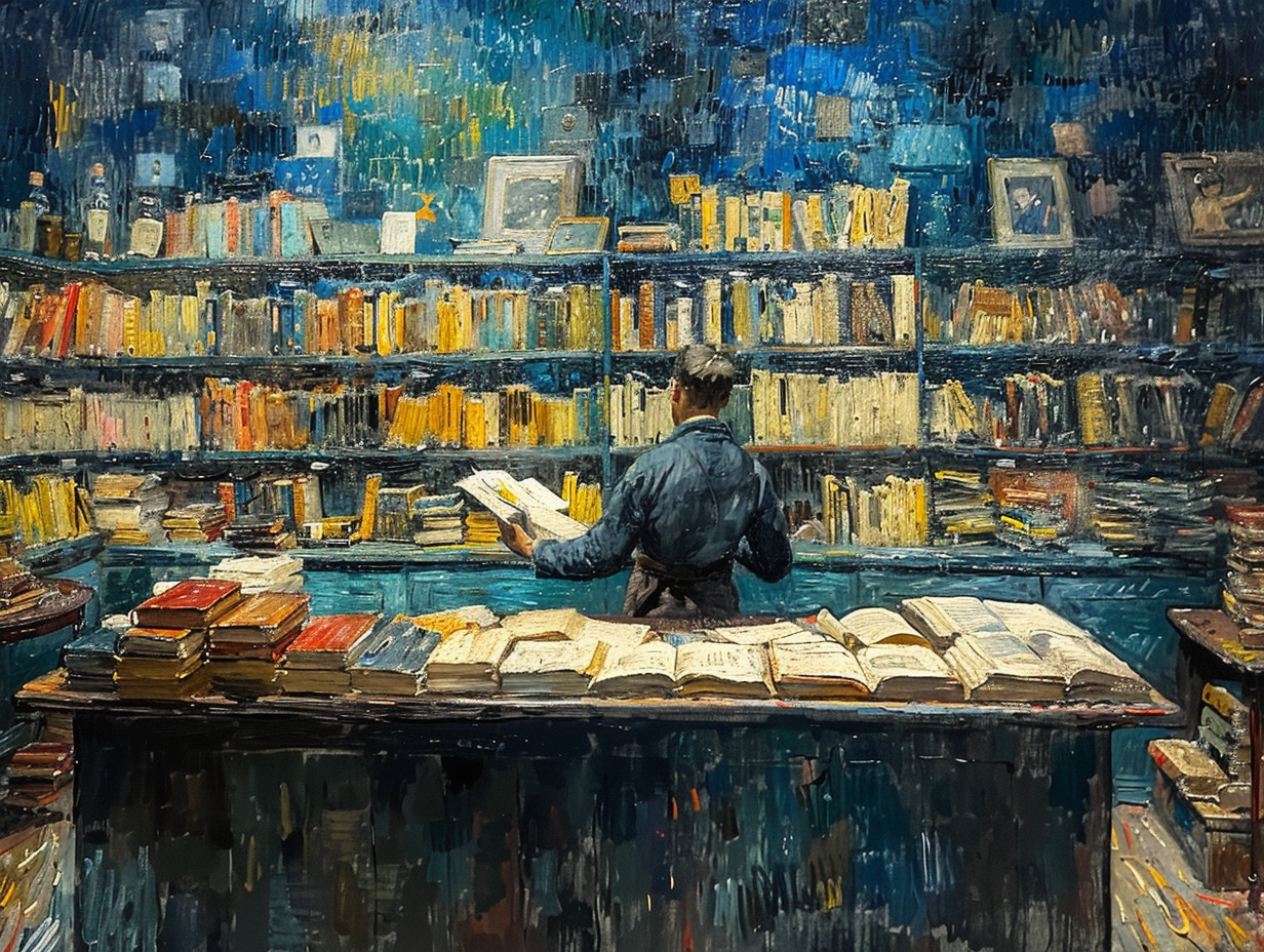 Prompt: A masterpiece, oil painting by Van Gogh, depicting the space of imagination filled with books, films, music, concepts, ideas, surrealism.
