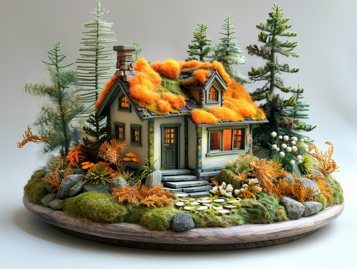 Prompt: 3D view, product beauty shot of a toy Forest cabin by Antonio Gaudi showcasing needle felting texture, lifestyle.