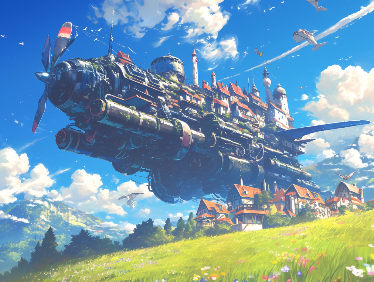 Prompt: Illustration by Ghibli, showing a long shot of Howl's Moving Castle in 8k, best quality, super detailed.